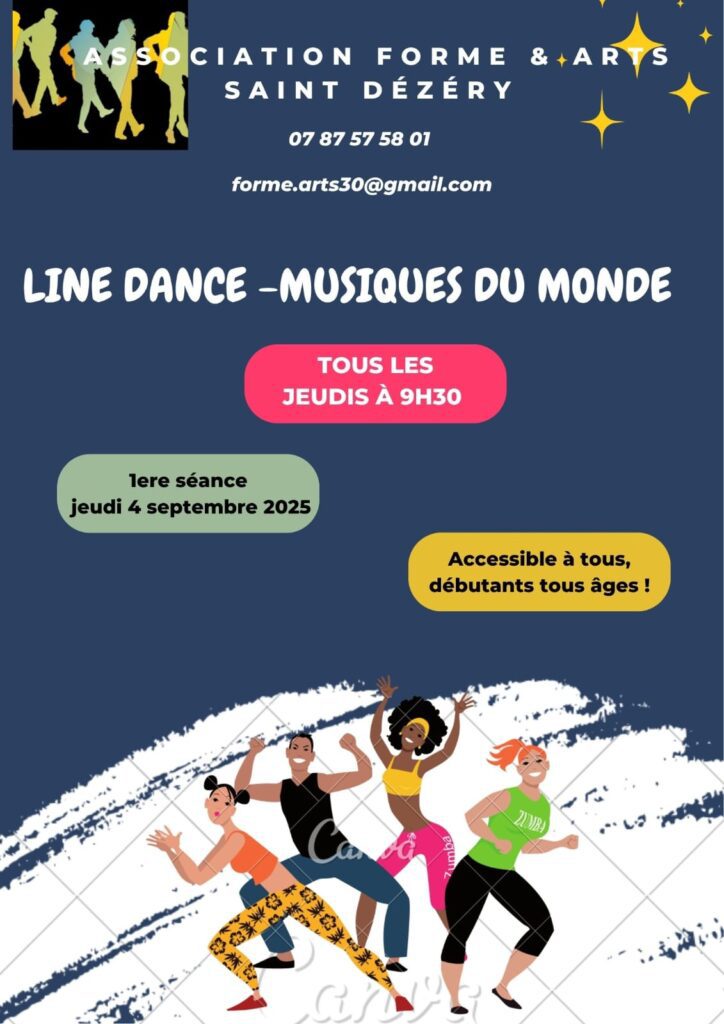 Valérie Pellet animera un cours de danse en ligne (line dance), à la salle communale de Saint-Dézéry le jeudi matin de 9h30 à 10h30. Ce cours est accessible à toutes