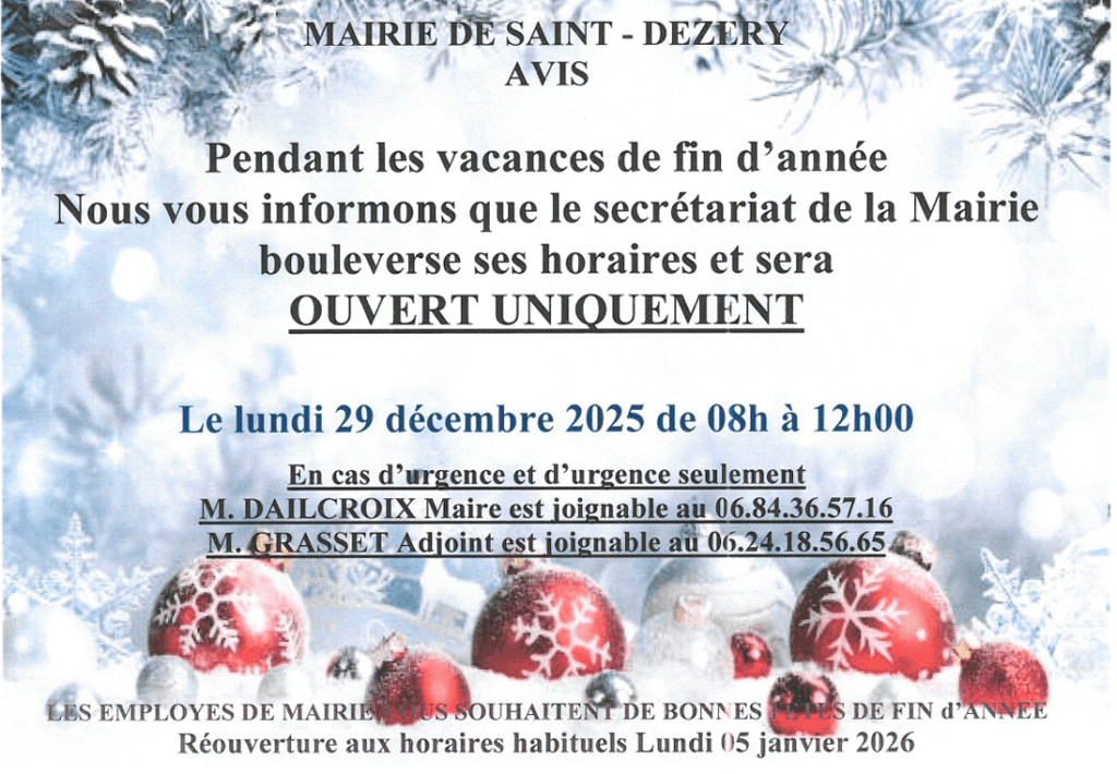 Fermeture du secrétariat de Mairie pendant les fêtes de fin d’année