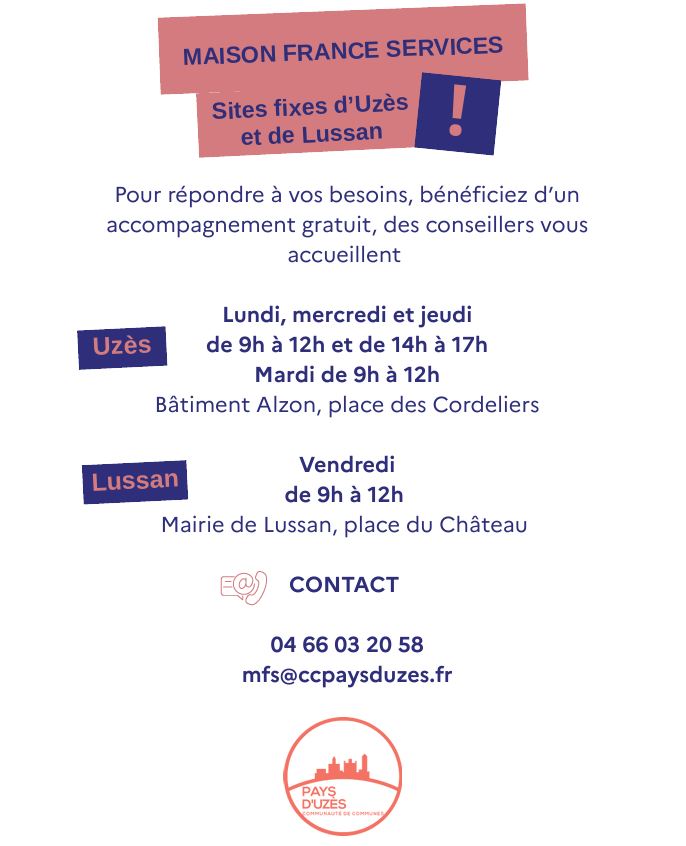 Il existe aussi 2 maisons fixes France Services à Uzès et Lussan où vous pouvez vous rendre. Tous les détails, adresses et horaires, sont ci-dessous.